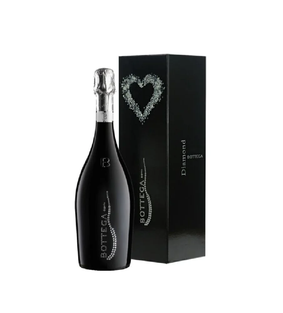 Experience the elegance and sophistication of Bottega Diamond Prosecco with its striking black bottle adorned with the iconic Bottega logo in shimmering diamante.