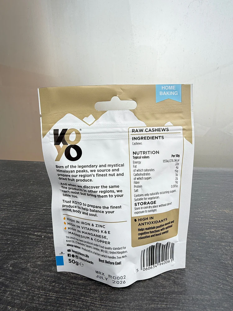 INGREDIENTS Cashews NUTRITION Typical values Per 50g Energy 1155kJ / 276.5Kcal Fat 22g of which saturates 4g Carbohydrates 15g of which sugars 3g Fibre 2g Protein 9g Salt 0.005g STORAGE Store in cool dry place without direct exposure to sunlight.