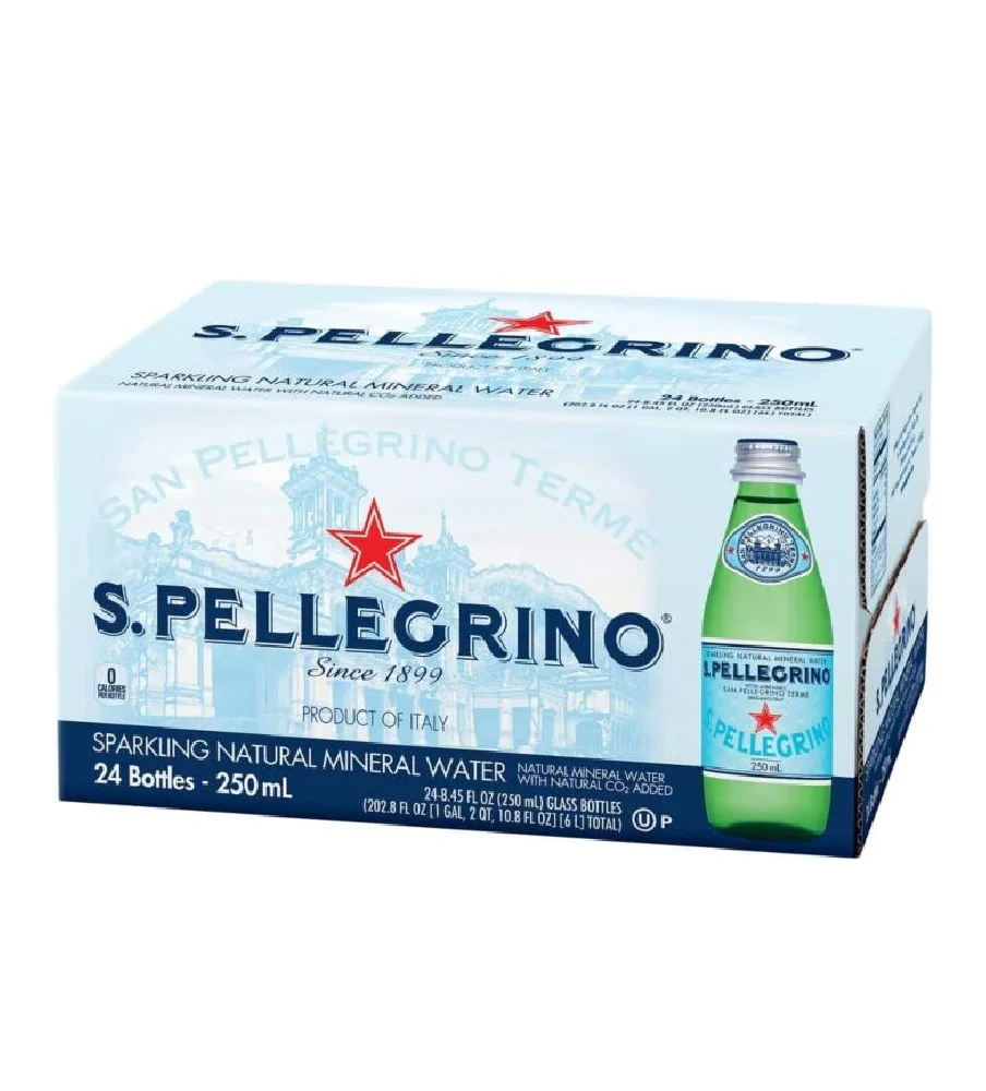 Experience the crisp, refined taste of San Pellegrino Sparkling Water (Glass) in a 24-pack of elegant 250ml glass bottles. Sourced from the Italian Alps, this water boasts gentle bubbles and a perfectly balanced mineral profile, embodying sophistication and purity.