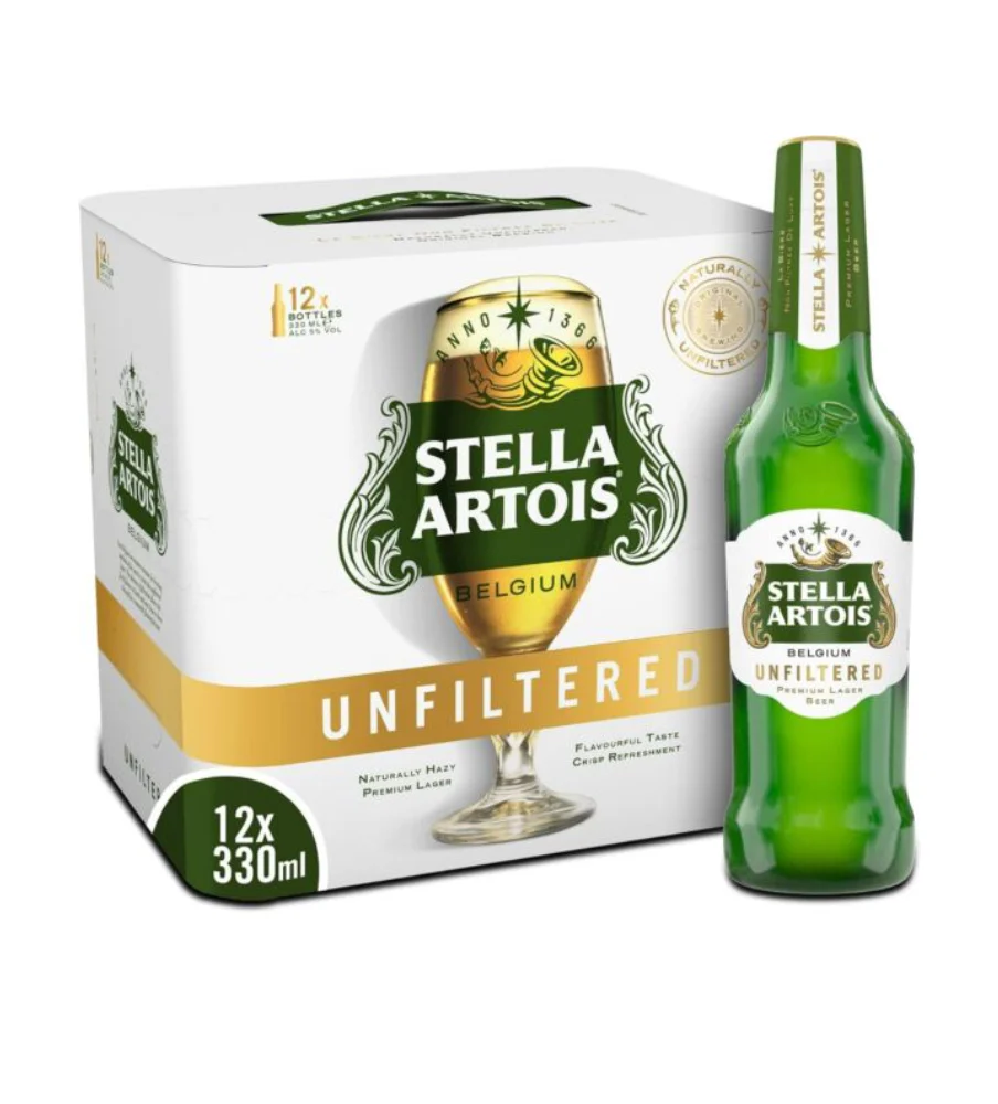 Stella Artois Unfiltered Lager ABV: 5% Crafted with a natural unfiltered process to enhance the flavor, this lager has a crisp and vibrant taste with a hazy golden appearance. Notes of malt and a smooth, refreshing finish make this beer stand out.